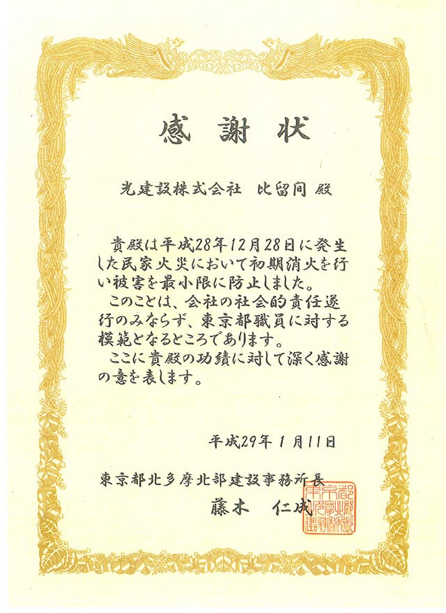 平成29年1月10日 東京消防庁 東村山消防署より光建設社員が感謝状をいただきました